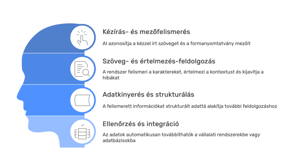 A rendszer automatikusan felismeri a nyomtatványok mezőit és a kézzel beírt értékeket, majd ezeket strukturált adatokká alakítja.